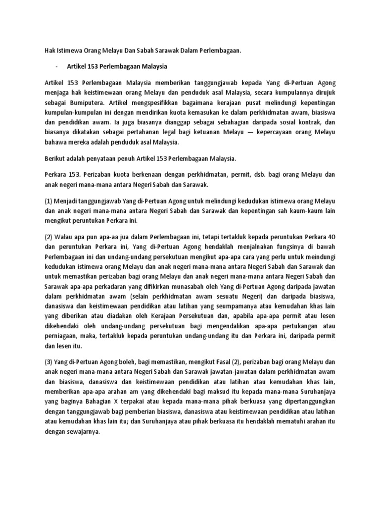 Related : Perkara 153 Perlembagaan Malaysia - Artikel 153 Perlembagaan Malaysia Perkobf Malaysia Facebook : Barangkali kerana kurang memahami sejarah watan tanah air dan peruntukan perlembagaan..
